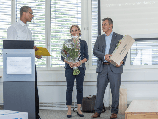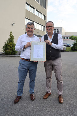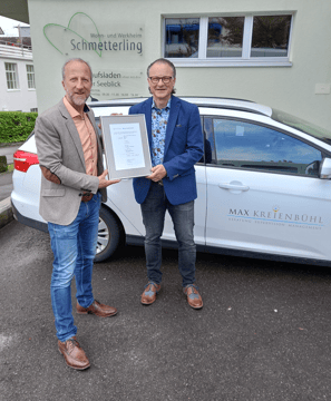 Max Kreienbühl übergibt Markus Einsiedler, Geschäftsführer des Wohn- und Werkheim Schmetterling in Cham das Zertifikat für "Werte- und Kultur Assessment".